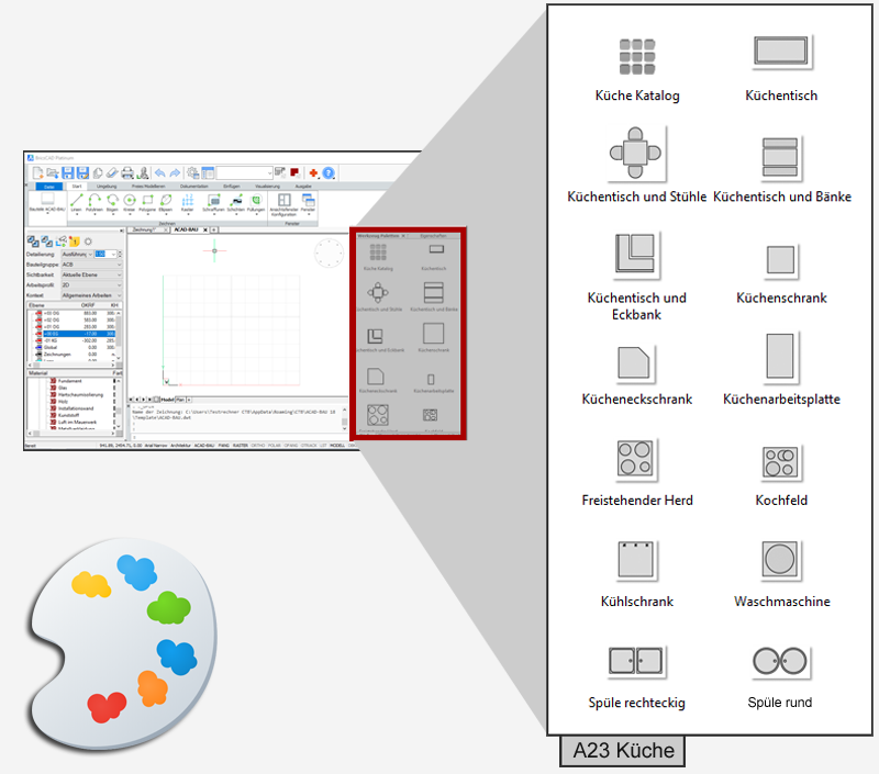 und Befehlen zu einem technischen Thema auf den Paletten: