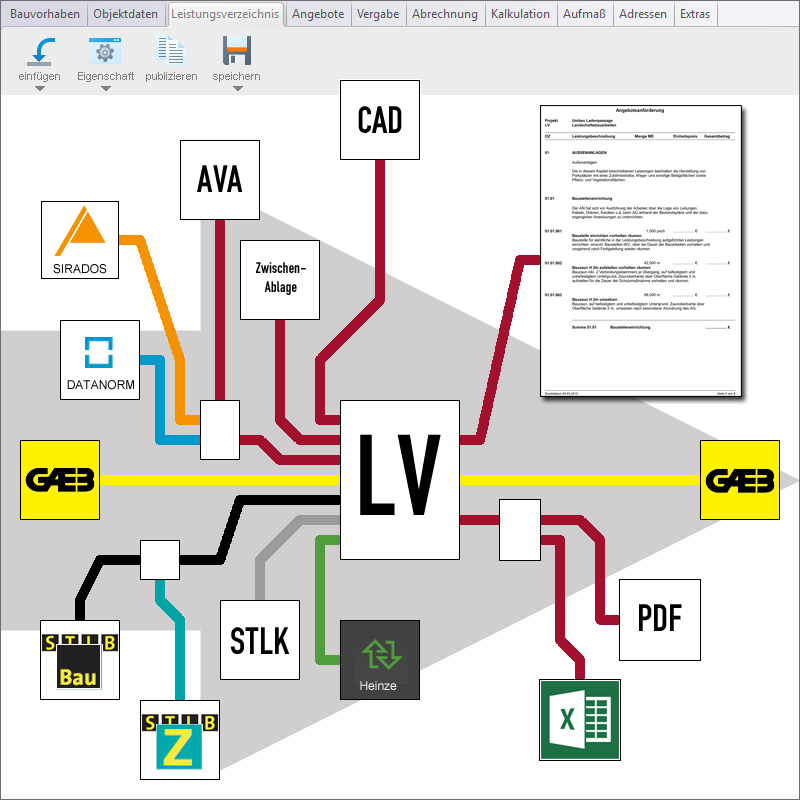 XML. ![]() In diesem Arbeitsbereich wird das Leistungsverzeichnis bearbeitet und ausgegeben bzw. exportiert. Das Anlegen, Öffnen und Löschen von Leistungsverzeichnissen befindet sich im Arbeitsbereich Bauvorhaben. Teilleistungen und LV-Bereiche werden manuell erstellt oder eingefügt aus: